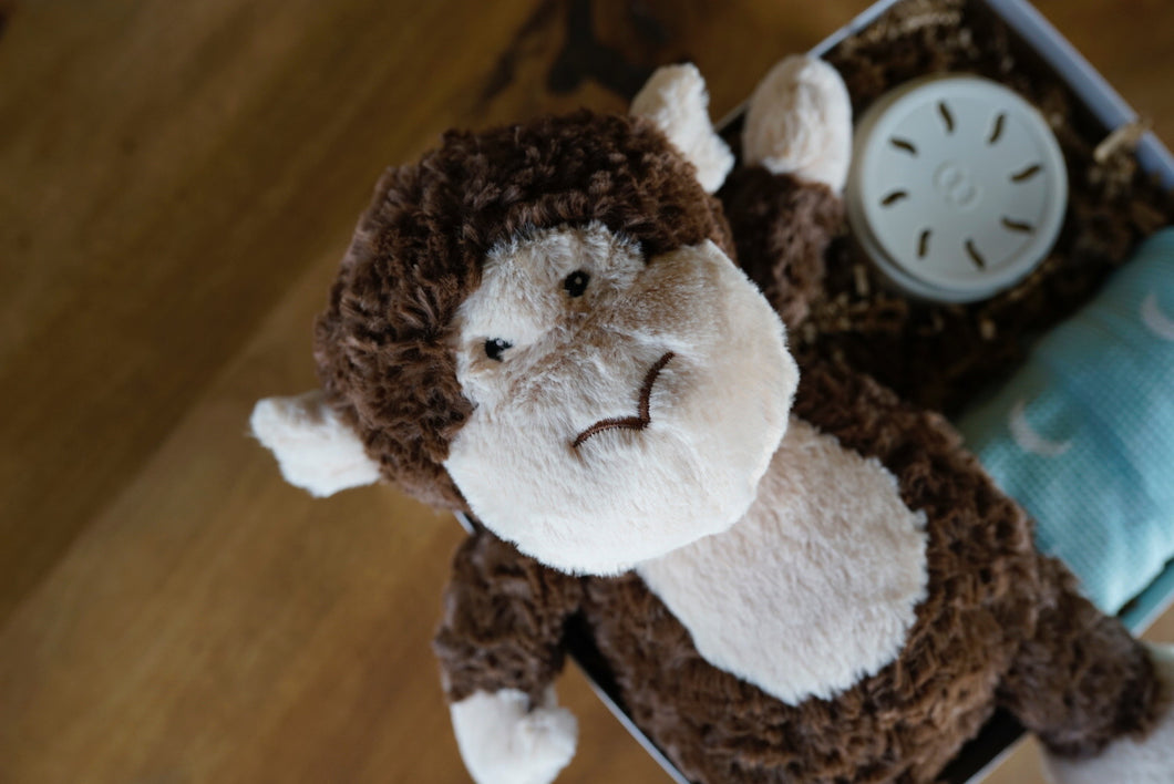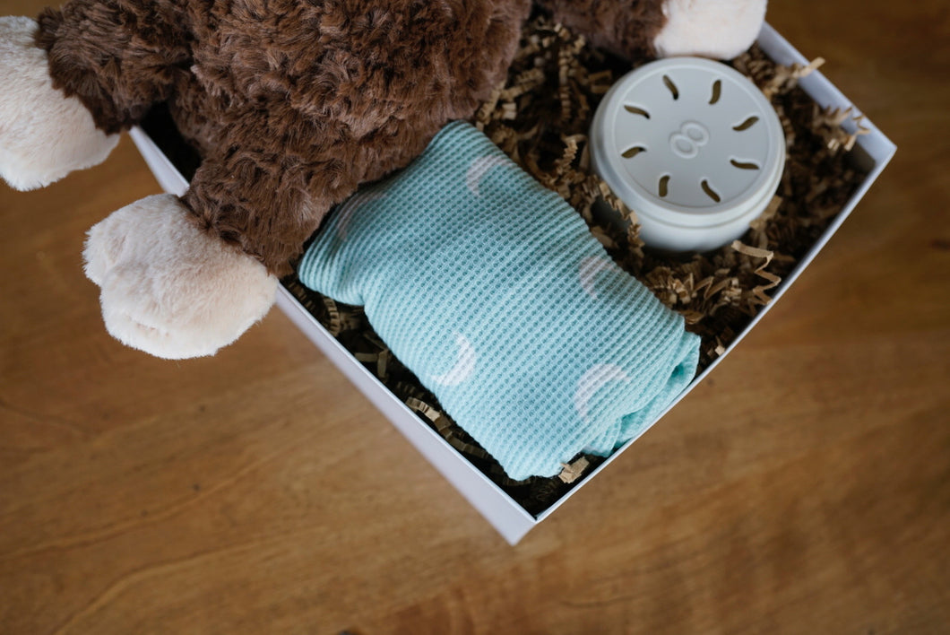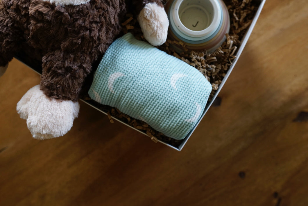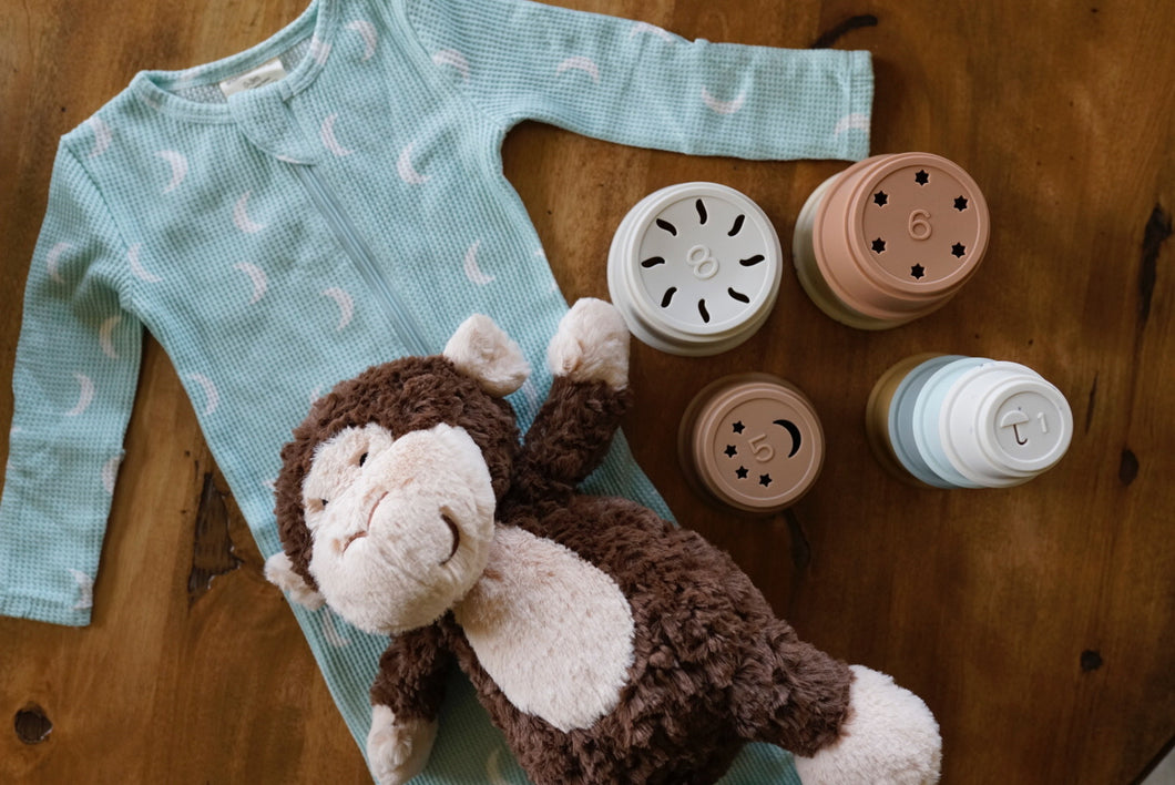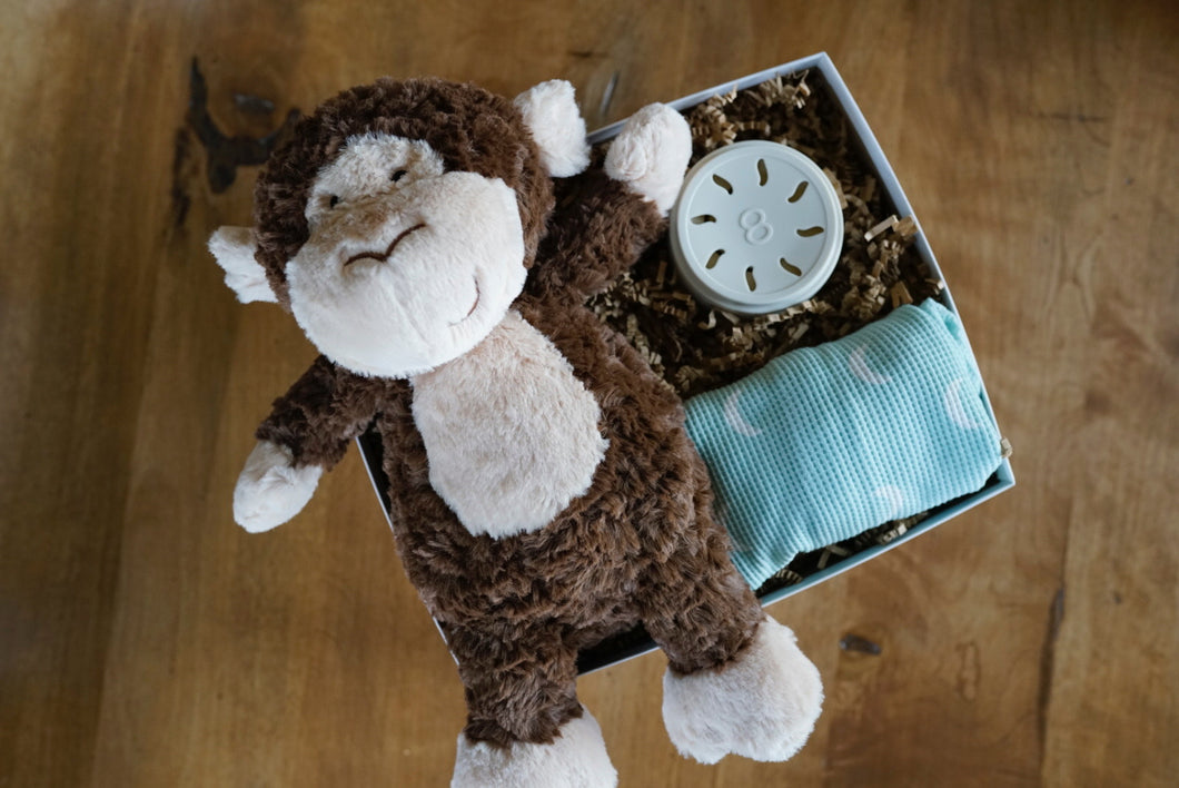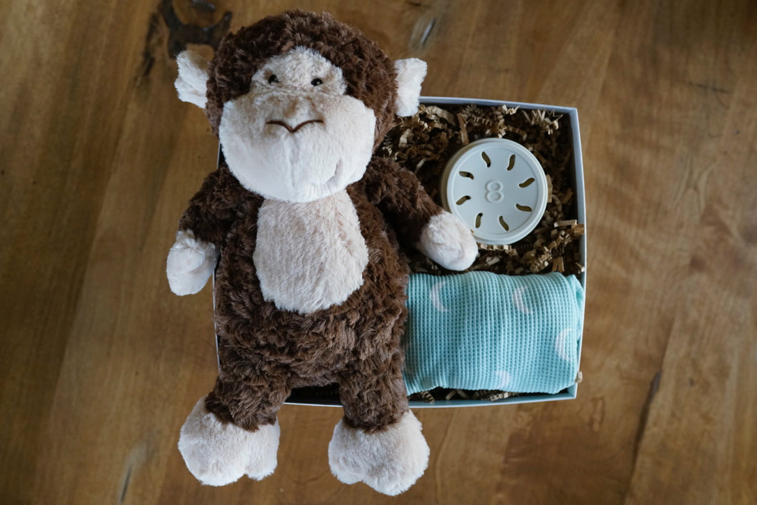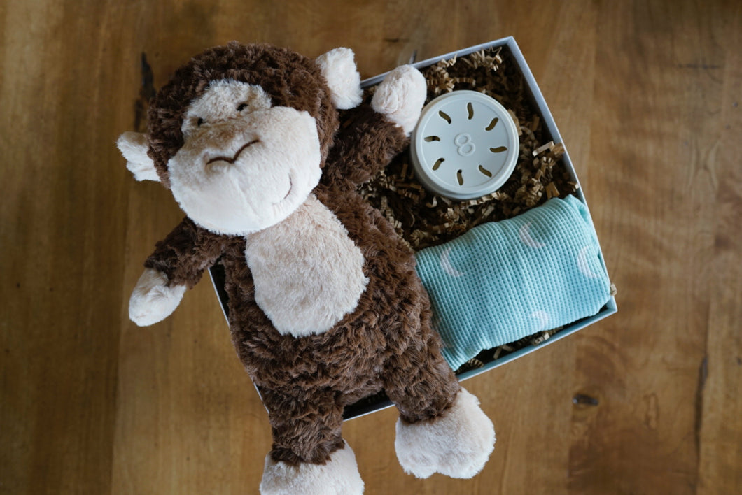 Welcome baby with the Monkey Business Boxtique! This charming gift box includes stacker cups for developing skills, a soft monkey buddy, and a cozy waffle footie.