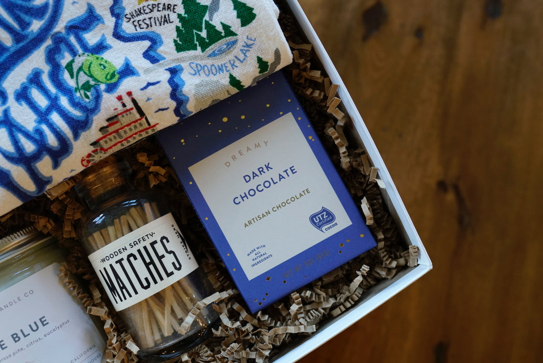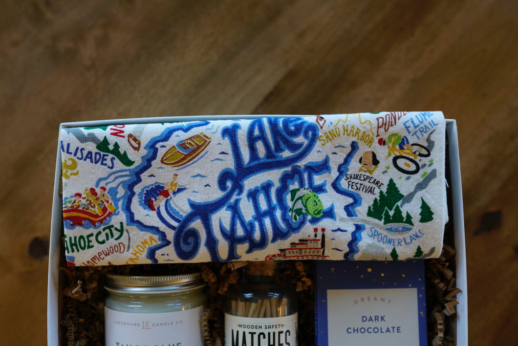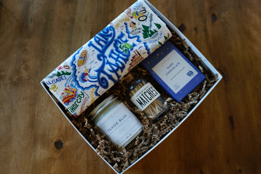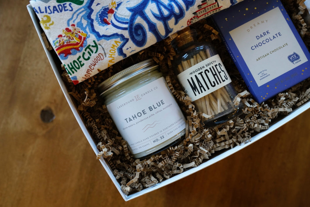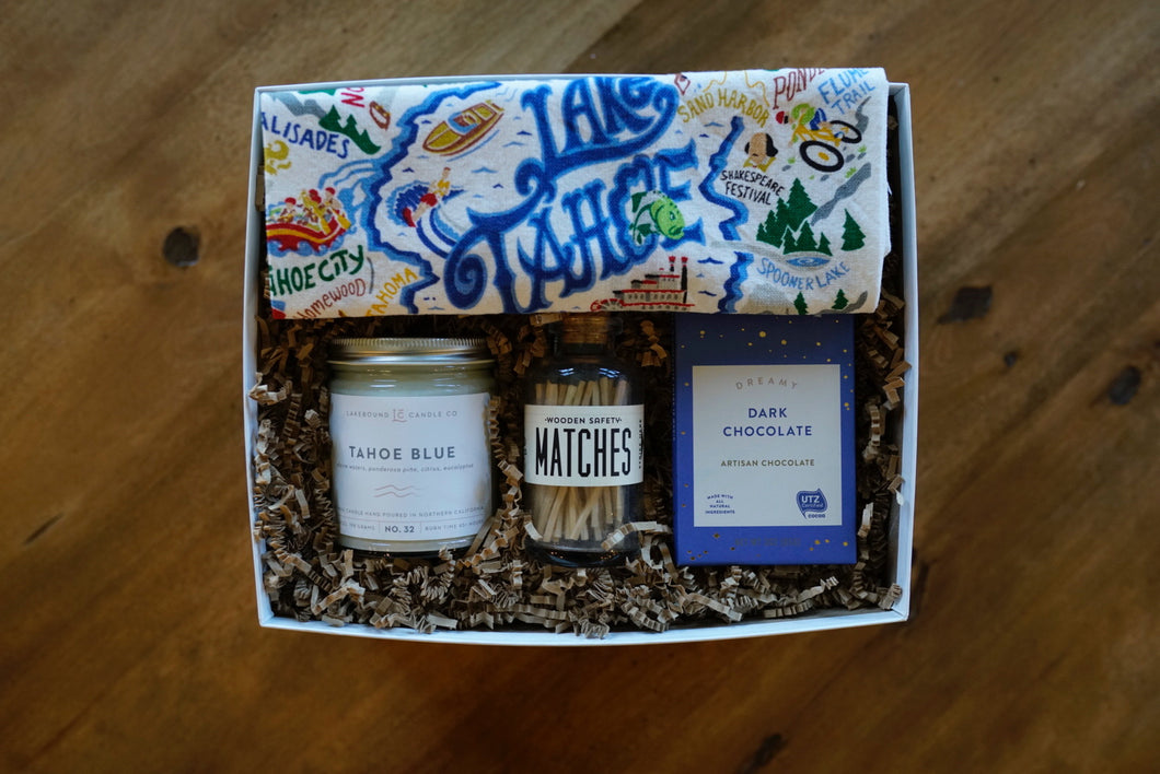Escape to the mountains with the Tahoe Blue gift box. This fun collection features a calming candle, dark chocolate, a Lake Tahoe kitchen towel, and matches—everything you need for cozy vibes at home.